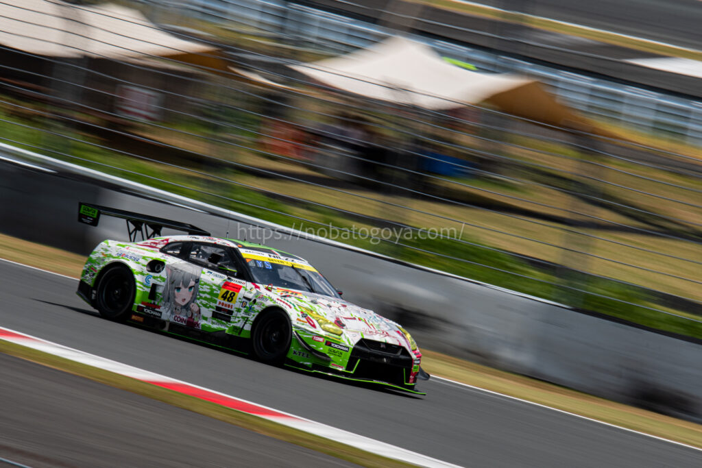 同じ場所からGT300の予選、今度は右下がりでながしています。現像でごまかしていますが露出が決めきれず白がとび気味なのが反省です。意識していなかったですが後ろにテントがあったりと意外と富士らしいかもしれません。