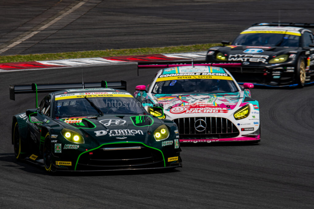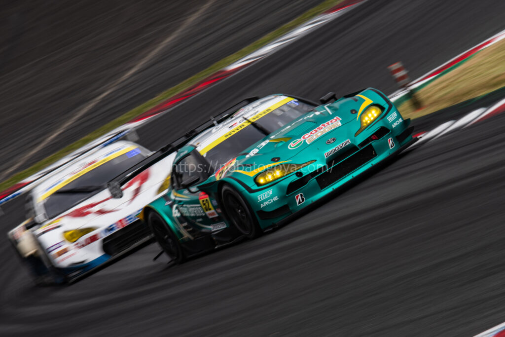 トヨタJAFGT同士のバトル。マッハ号は2025年は過去ベストシーズンの一つだったのではないでしょうか。先ほどより少し最終コーナー側でしょうか。欲を言えば前のスープラがもう少し右だとよりよいのですが、後ろのマシンの流れ具合は結構いい感じじゃないでしょうか。